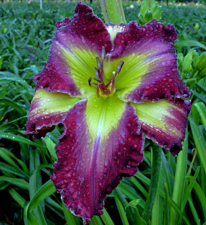 9.5″ Royal purple with watermark, huge green throat and ruffled silver edge