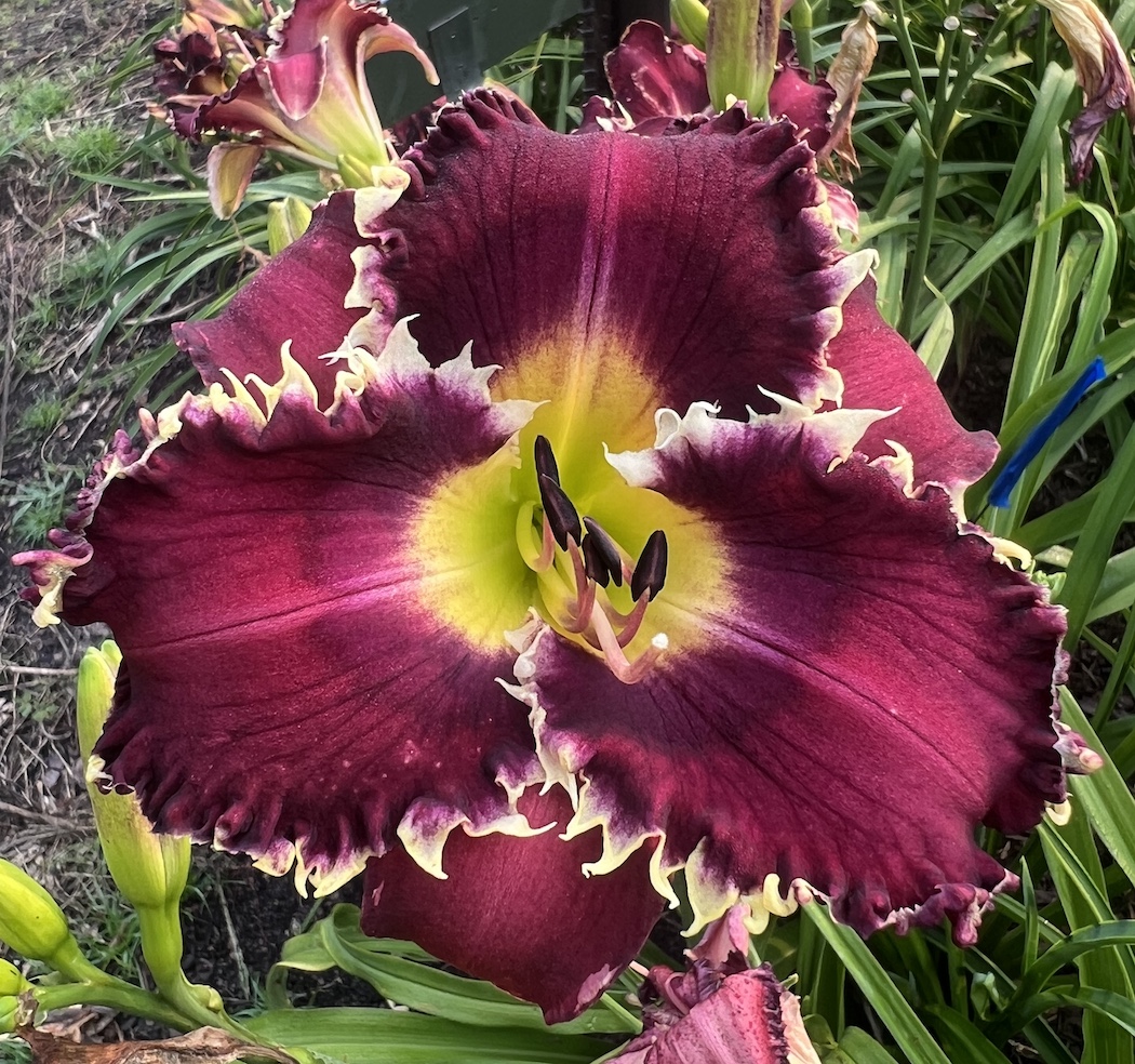 A 5.25″ medium purple with a violet purple eye & green throat. It is edged in white teeth, has 3 way branching with 17 buds.