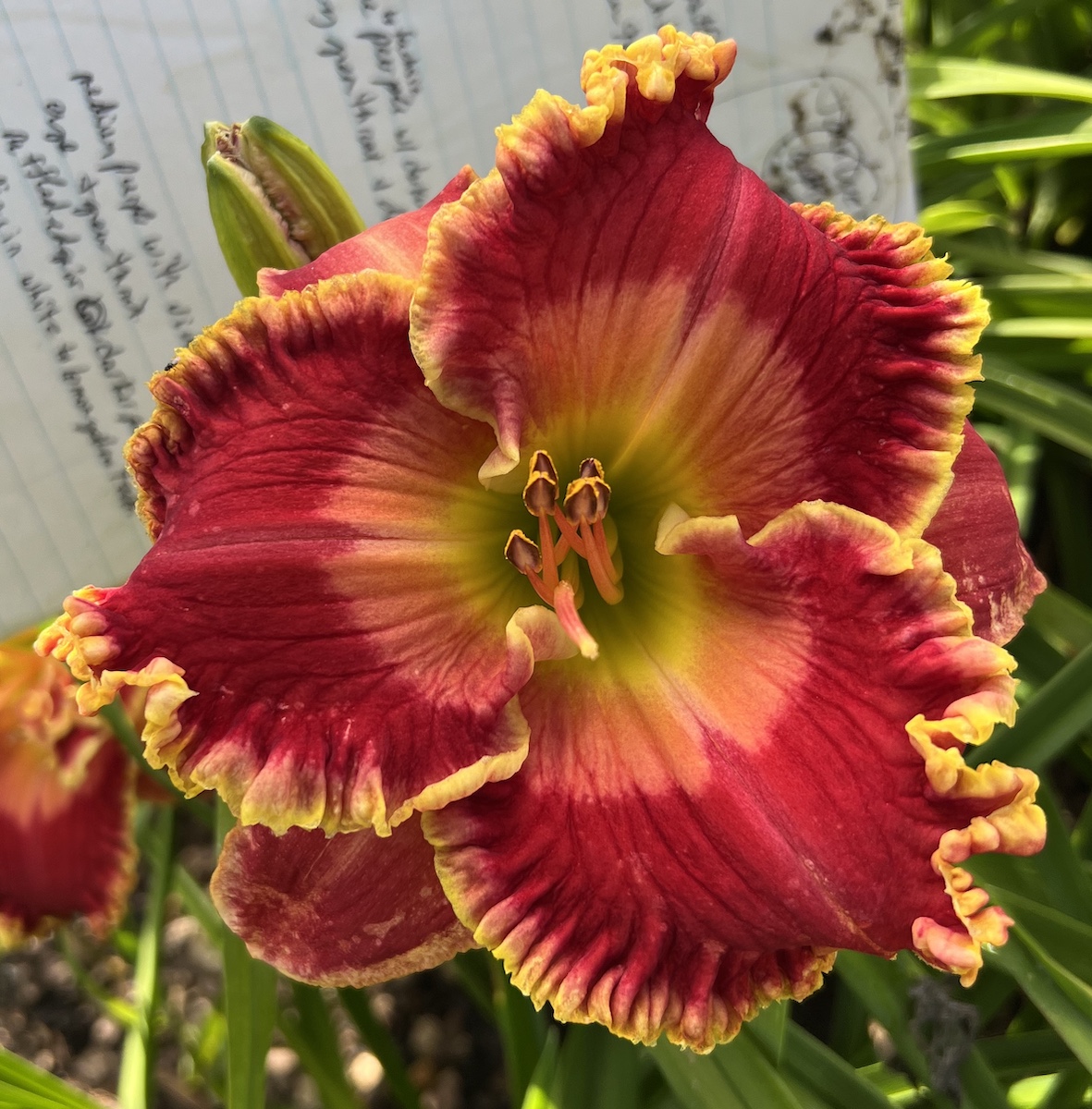A 5.75″ coral red with a lighter coral watermark and a green throat ending in a ruffled gold edge. It has 3 way branching with 15 buds.
