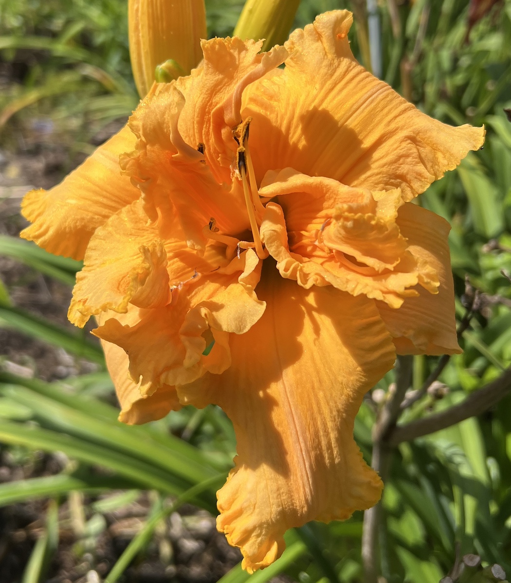 A 6″ ruffled double light tangerine with darker highlights. It has 5 way branching with 26 buds.