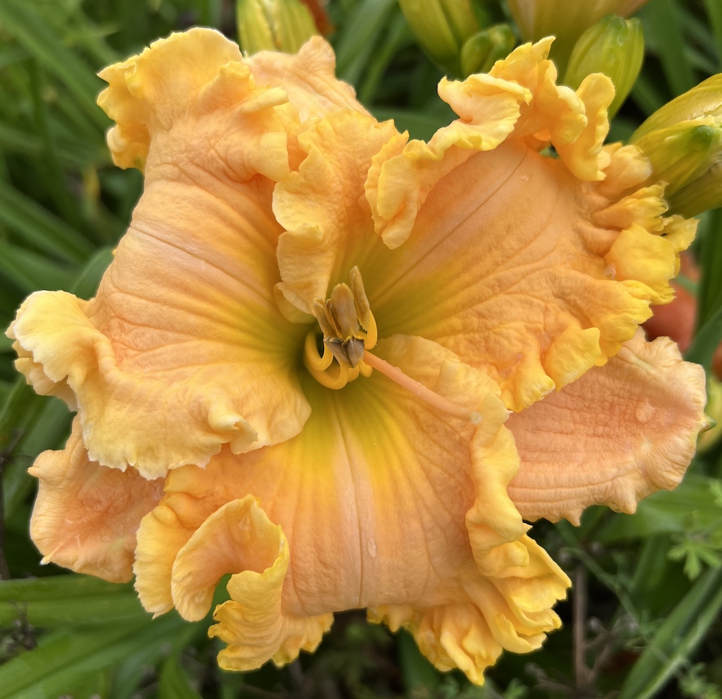 A 5.5″ heavily ruffled gold with a green throat. It has 3 way branching with 18 buds.